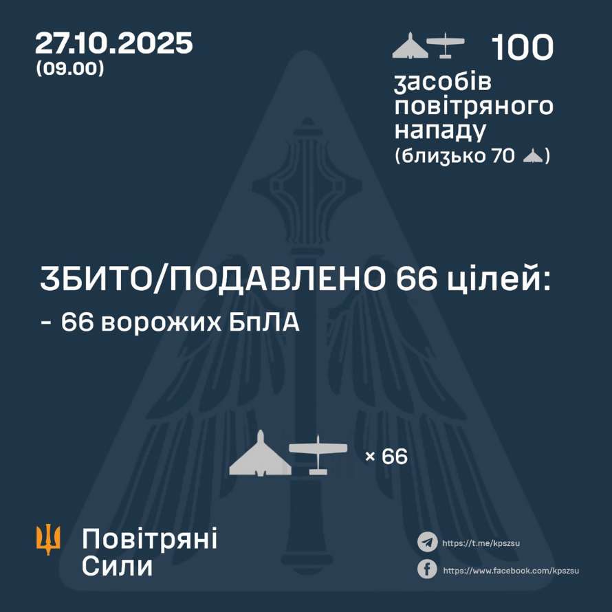 У ніч на 27 жовтня (з 18:30 26 жовтня) противник атакував 100 ударними БпЛА типу Shahed, Гербера і безпілотниками інших типів із напрямків: Курськ, Орел, Приморсько-Ахтарськ – рф, близько 70 із них – "шахеди".