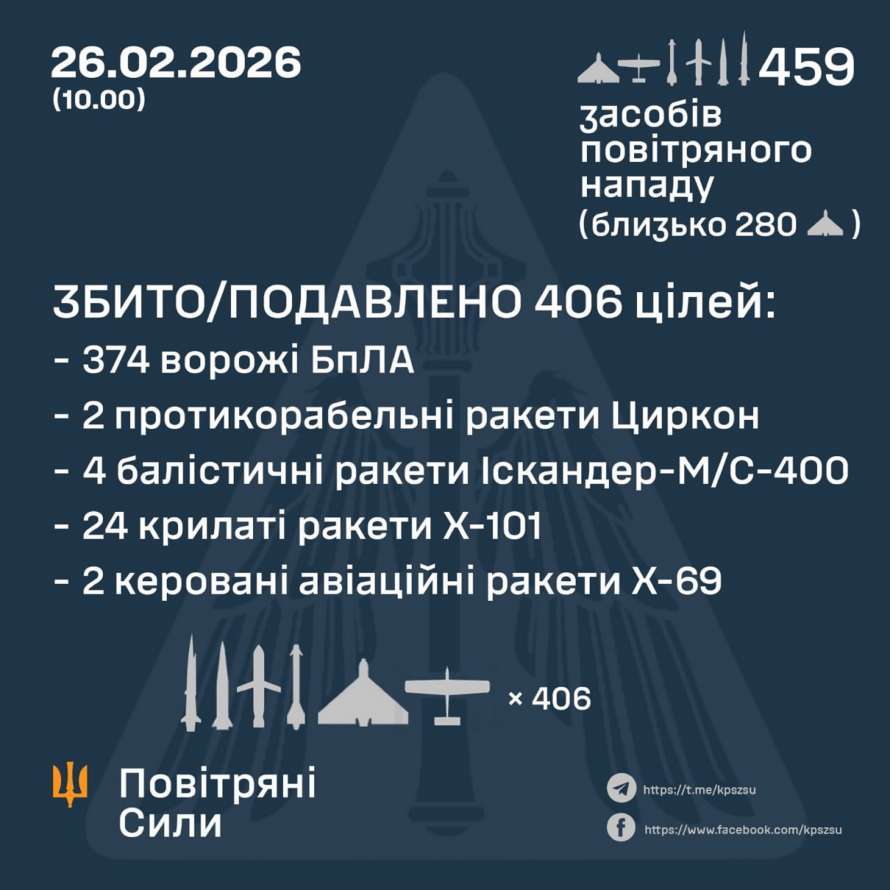 У ніч на 26 лютого (з 18:00 25 лютого) противник атакував 2 протикорабельними ракетами Циркон із ТОТ АР Крим, 11 балістичними ракетами Іскандер-М/С-400 із Брянської, Ростовської областей рф, 24 крилатими ракетами Х-101 (район пуску - Вологодська обл., рф), 2 керованими авіаційними ракетами Х-69, а також 420 ударними БпЛА типу Shahed, Гербера, Італмас та безпілотниками інших типів із напрямків: Міллерово, Курськ, Брянськ, Орел, Шаталово, Приморсько-Ахтарськ – рф., Гвардійське – ТОТ АР Крим, близько 280 із них – "шахеди".