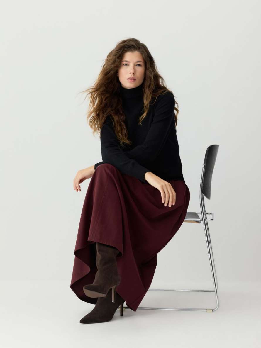 Щільний гольф у відтінках кремового, сірого або графітового кольору чудово поєднується з довгою спідницею і класичним пальтом. Додай ботильйони на підборах і ніжні прикраси — отримаєш жіночний, гармонійний образ, який пасує як до офісу, так і до вечірньої прогулянки.