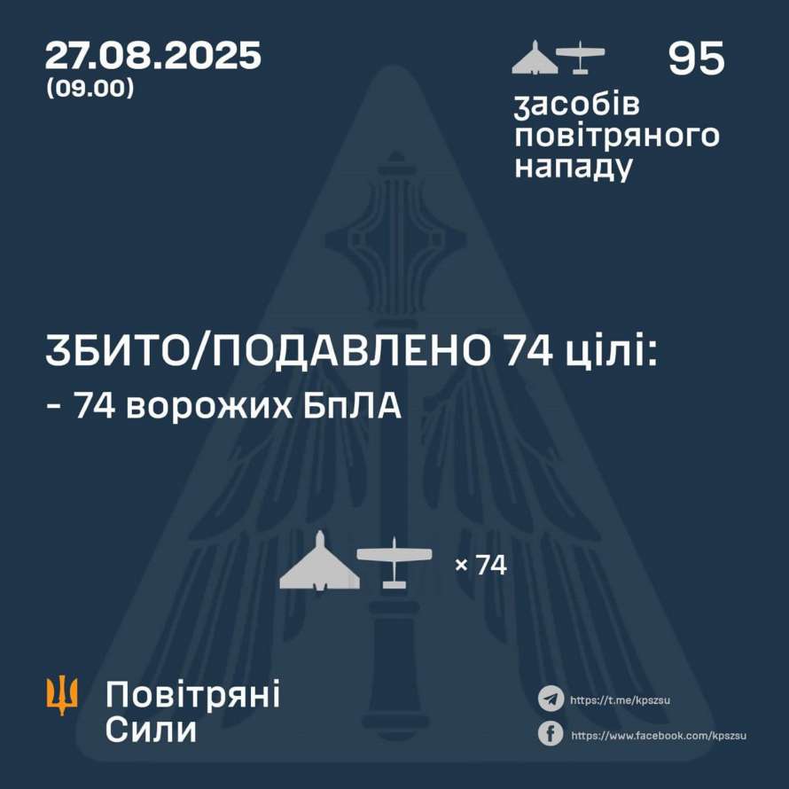 У ніч на 27 серпня (із 20.30 26 серпня) противник атакував 95-ма ударними БпЛА типу Shahed і безпілотниками-імітаторами різних типів із напрямків: Курськ, Міллерово, Орел, Приморсько-Ахтарськ – рф., Чауда - ТОТ Криму.
