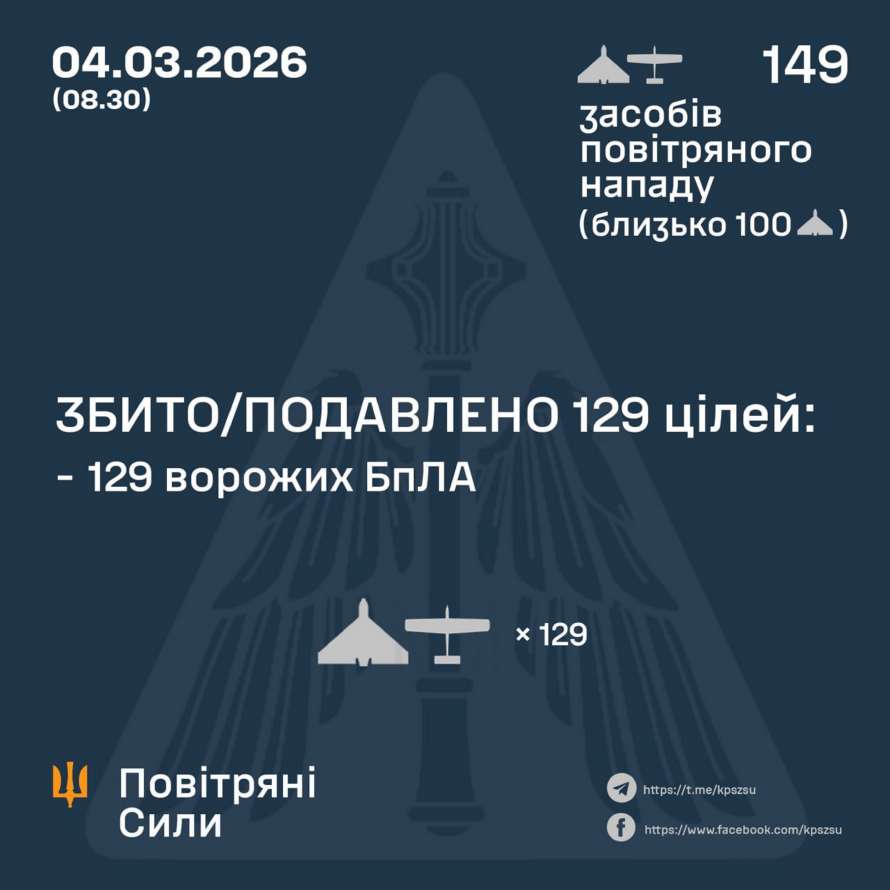 У ніч на 4 березня (з 18:00 3 березня) противник атакував 149 ударними БпЛА типу Shahed, Гербера, Італмас та безпілотниками інших типів із напрямків: Брянськ, Курськ, Міллерово, Приморсько-Ахтарськ – рф., Гвардійське – ТОТ АР Крим, близько 100 із них – "шахеди".