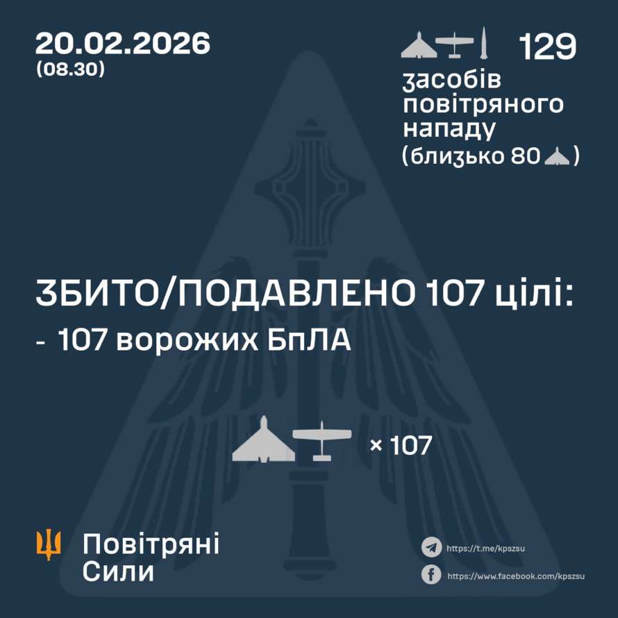 У ніч на 20 лютого (з 18:00 19 лютого) противник атакував однією балістичною ракетою Іскандер-М із Ростовської обл. – рф, а також 128 ударними БпЛА типу Shahed, Гербера, Італмас та безпілотниками інших типів із напрямків: Брянськ, Курськ, Орел, Шаталово, Приморсько-Ахтарськ – рф., ТОТ Донецька обл., близько 80 із них – "шахеди".