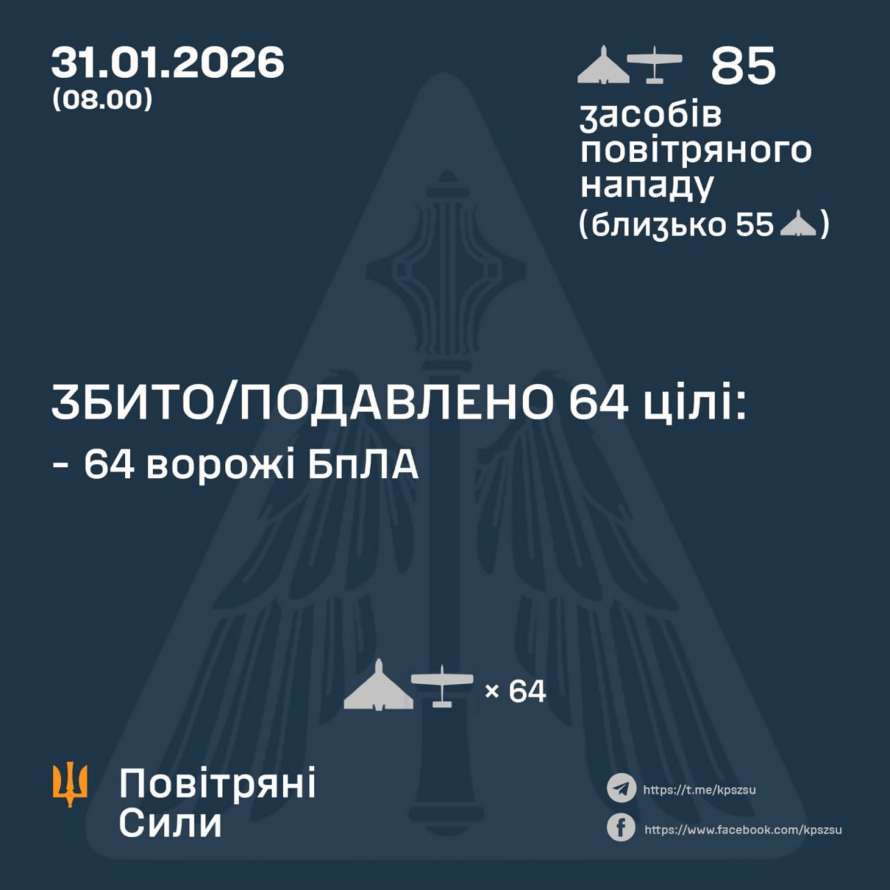 У ніч на 31 січня (з 17:40 30 січня) противник атакував 85 ударними БпЛА типу Shahed, Гербера, Італмас та безпілотниками інших типів із напрямків: Орел, Міллерово, Приморсько-Ахтарськ – рф., близько 55 із них – "шахеди".