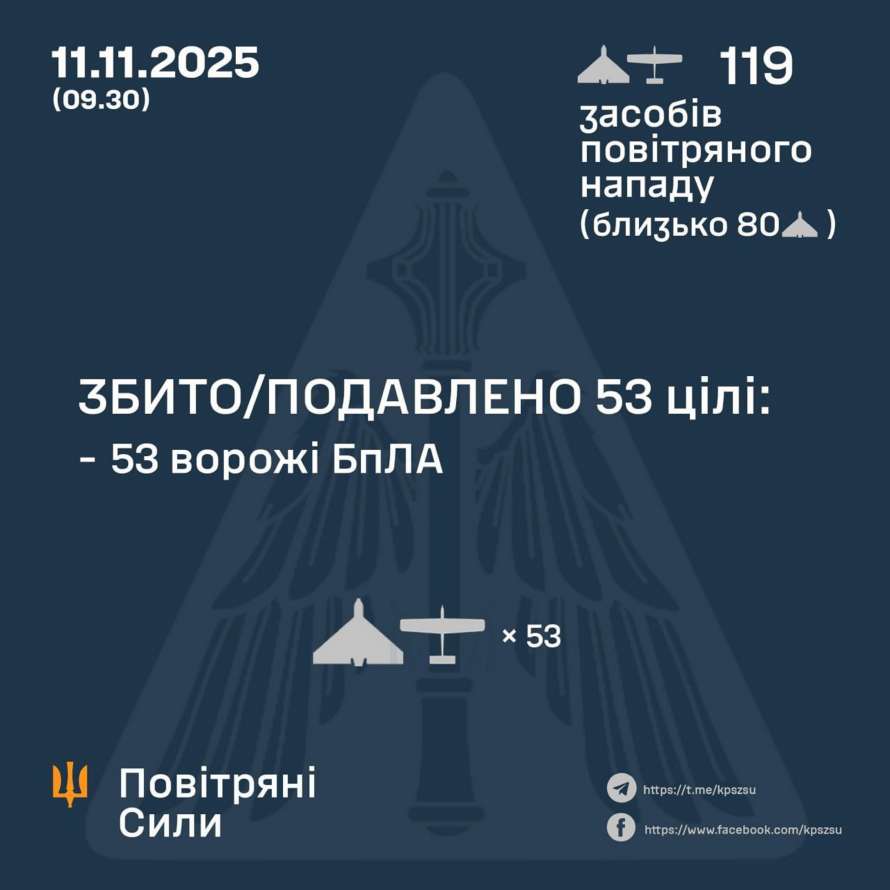 У ніч на 11 листопада (з 18:00 10 листопада) противник атакував 119 ударними БпЛА типу Shahed, Гербера і безпілотниками інших типів із напрямків: Курськ, Міллєрово, Орел, Брянськ - рф, Гвардійське – ТОТ АР Крим, близько 80 із них – "шахеди".