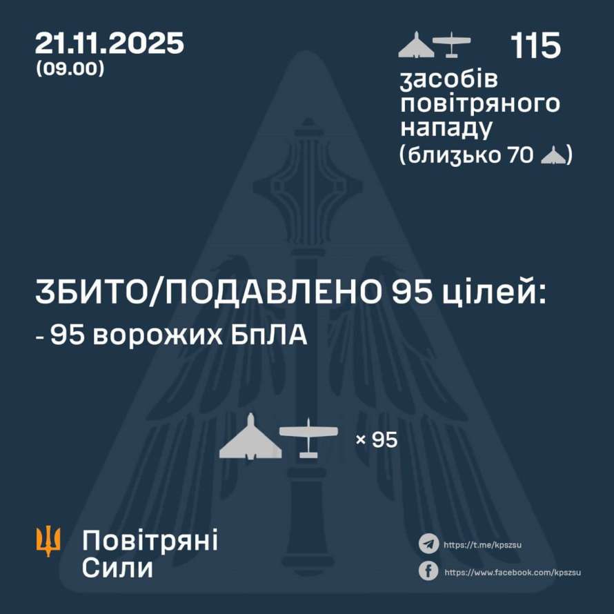 У ніч на 21 листопада (з 18:00 20 листопада) противник атакував 115-ма ударними БпЛА типу Shahed, Гербера і безпілотниками інших типів із напрямків: Курськ, Орел, Міллерово, Приморсько-Ахтарськ – рф, Гвардійське - ТОТ АР Крим, близько 70 із них – "шахеди".