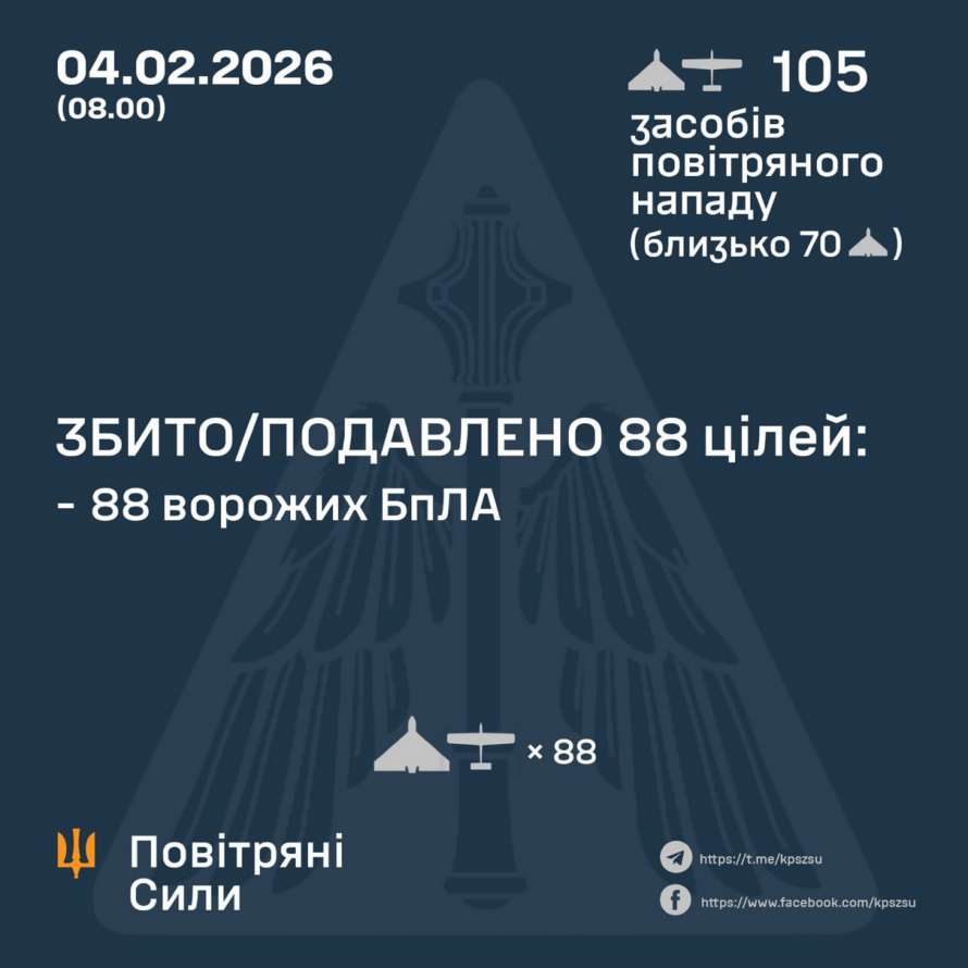 За попередніми даними, станом на 08:00, протиповітряною обороною збито/подавлено 88 ворожих БпЛА типу Shahed, Гербера, Італмас та дронів інших типів на півночі, півдні та сході країни.