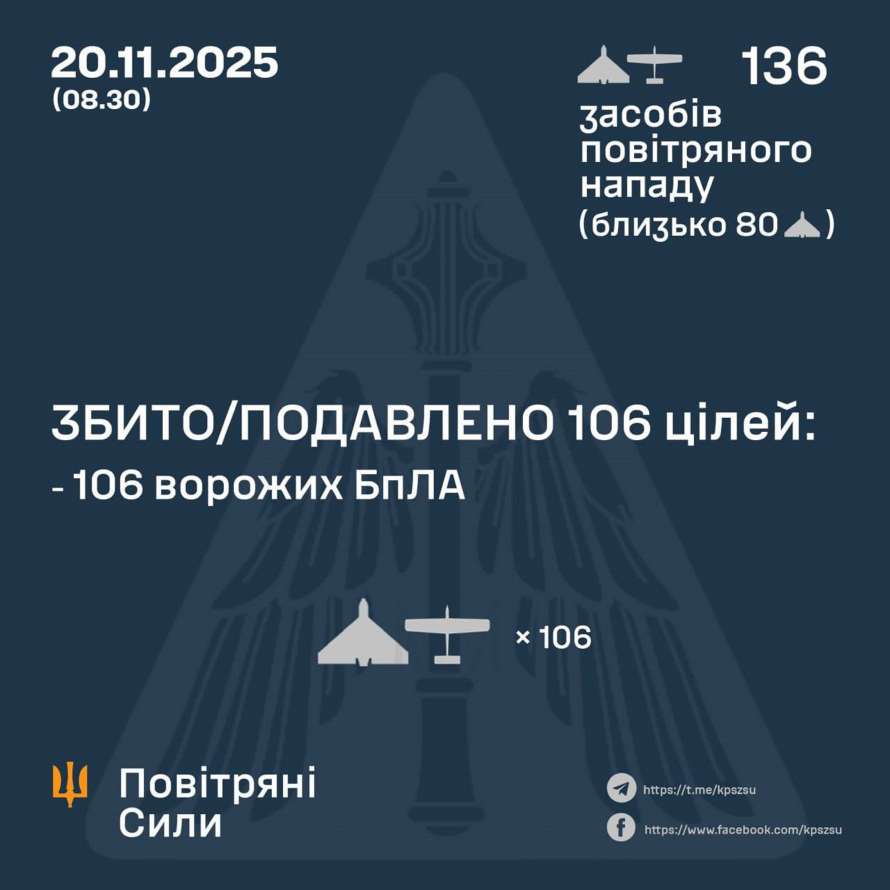 У ніч на 20 листопада (з 18:00 19 листопада) противник атакував 136-ма ударними БпЛА типу Shahed, Гербера і безпілотниками інших типів із напрямків: Курськ, Орел, Міллерово, Брянськ, Шаталово, Приморсько-Ахтарськ – рф, Гвардійське - ТОТ АР Крим, близько 80 із них – "Шахеди".