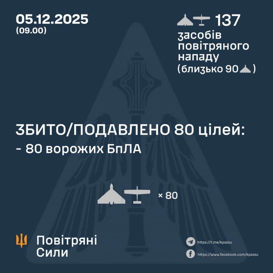 У ніч на 5 грудня (з 19:00 4 грудня) противник атакував 137-ма ударними БпЛА типу Shahed, Гербера і безпілотниками інших типів із напрямків: Курськ, Орел, Міллерово, Приморсько-Ахтарськ – рф, Чауда - ТОТ АР Крим, близько 90 із них – "шахеди".