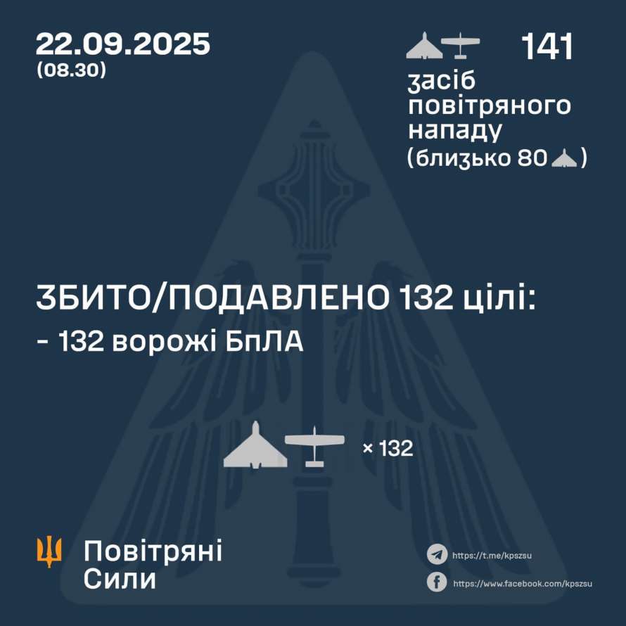 У ніч на 22 вересня (із 21.00 21 вересня) противник атакував 141-м ударним БпЛА типу Shahed, Гербера і безпілотниками інших типів із напрямків: Курськ, Орел, Приморсько-Ахтарськ – рф., Чауда - ТОТ Криму, близько 80 із них – шахеди.