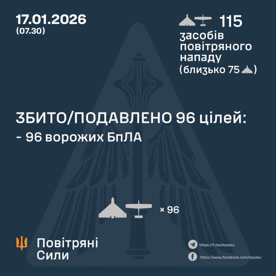 У ніч на 17 січня (з 18:00 16 січня) противник атакував 115 ударними БпЛА типу Shahed, Гербера, Італмас і безпілотниками інших типів із напрямків: Міллєрово, Курськ, Орел, Приморсько-Ахтарськ – рф., Донецьк - ТОТ України, близько 75 із них – "шахеди".