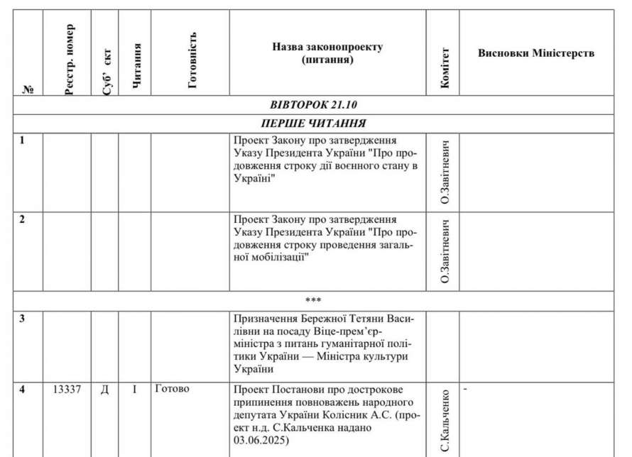 Як повідомляє нардеп Ярослав Железняк, голосування за продовження воєнного стану та мобілізації заплановано на 21 жовтня.