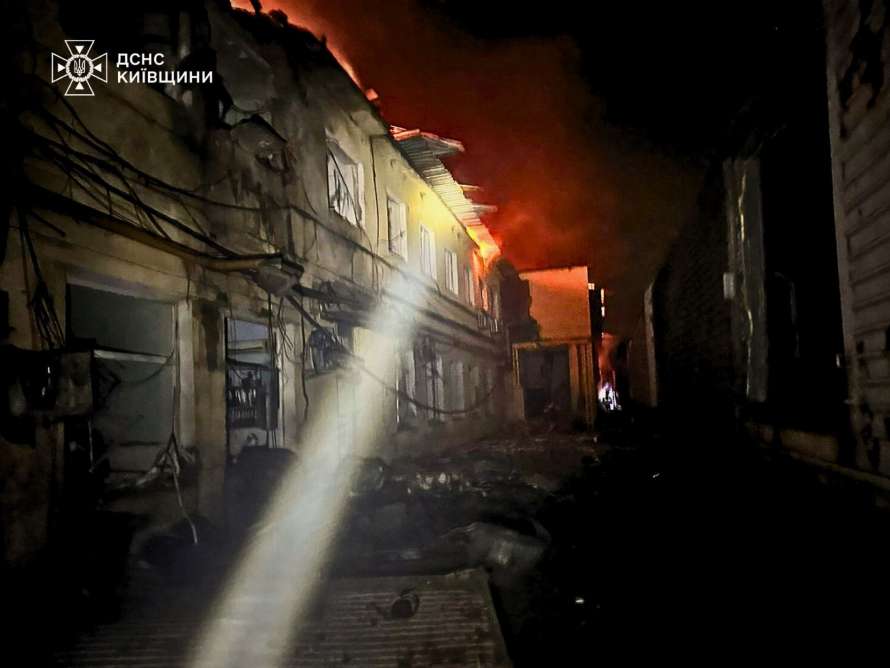"Російські війська знову завдали ударів БпЛА по м. Фастів. Зайнялися покрівлі 3-поверхової та одноповерхової будівель на площі 1500 кв. м", - повідомляє ДСНС.