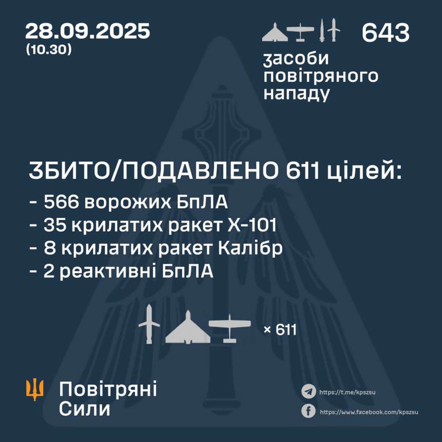 У ніч на 28 вересня (із 20.30 27 вересня) противник завдав комбінованого удару по території України із застосуванням ударних БпЛА, ракет повітряного та морського базування.