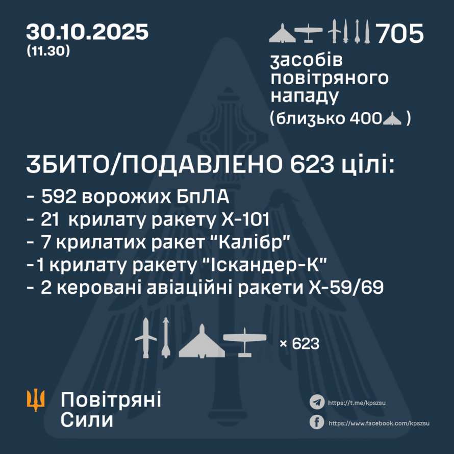 У ніч на 30 жовтня (з 19:00 29 жовтня) противник завдав комбінованого удару по об'єктах критичної інфраструктури України із застосуванням ударних БпЛА, ракет повітряного, наземного та морського базування.
