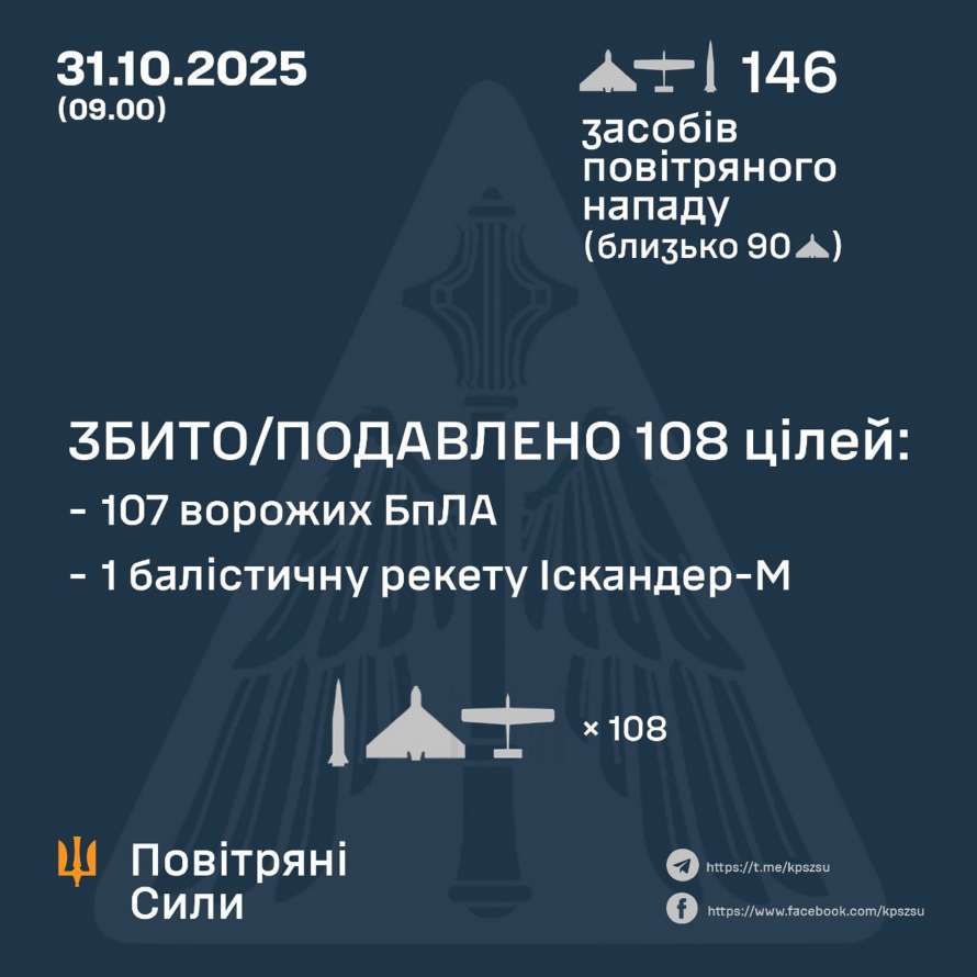 У ніч на 31 жовтня (з 19:00 30 жовтня) противник атакував 1 балістичною ракетою Іскандер-М із Ростовської обл., 145-ма ударними БпЛА типу Shahed, Гербера і безпілотниками інших типів із напрямків: Курськ, Орел, Приморсько-Ахтарськ – рф, Чауда, Гвардійське – ТОТ АР Крим, близько 90 із них – "шахеди".