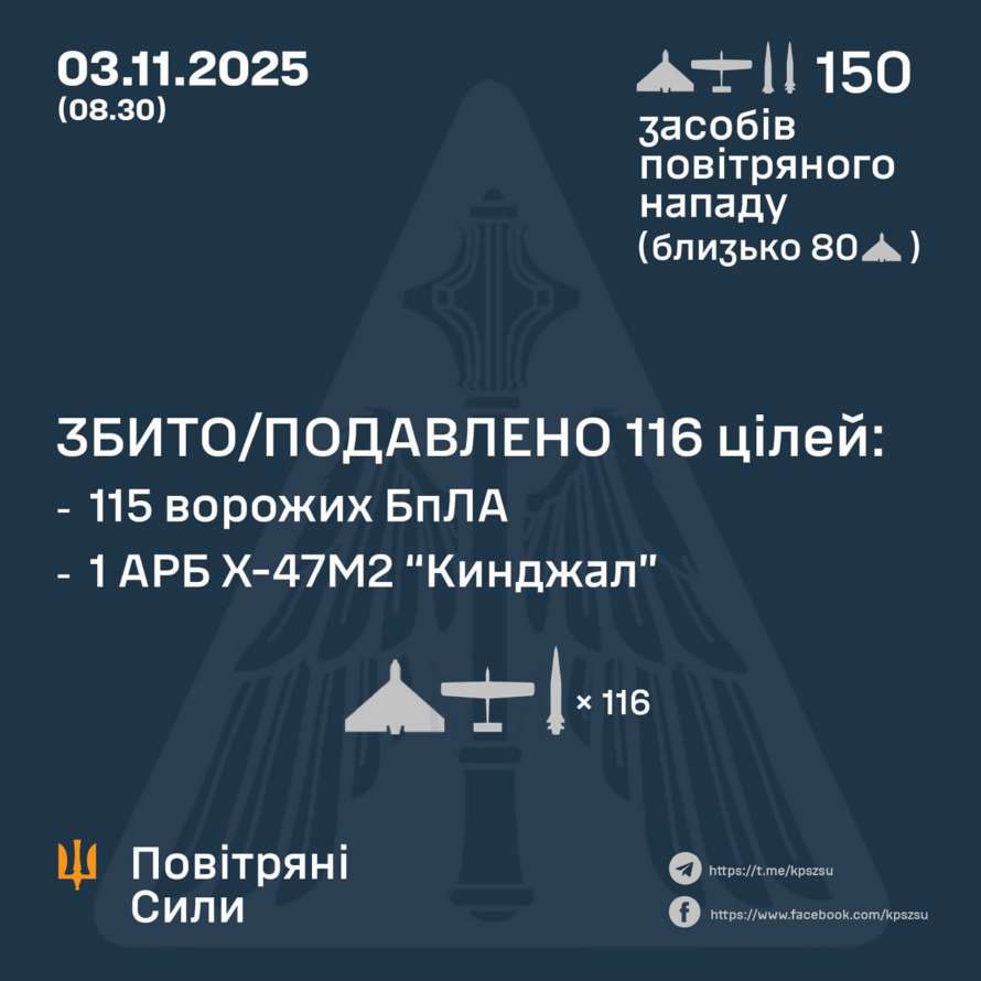 У ніч на 3 листопада (з 19:00 02 листопада) противник атакував трьома аеробалістичними ракетами Х-47М2 «Кинджал» із повітряного простору Липецької обл., чотирма балістичними ракетами Іскандер-М із ТОТ АР Крим, п’ятьма зенітними керованими ракетами С-300/С-400 із Курської обл., а також 138 ударними БпЛА типу Shahed, Гербера і безпілотниками інших типів із напрямків: Курськ, Міллєрово, Орел, Приморсько-Ахтарськ – рф, близько 80 із них – "шахеди".