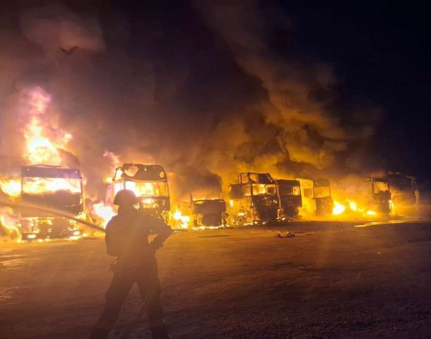У результаті влучань загорілися сім вантажних автомобілів. Вогонь був настільки сильним, що машини вигоріли повністю.