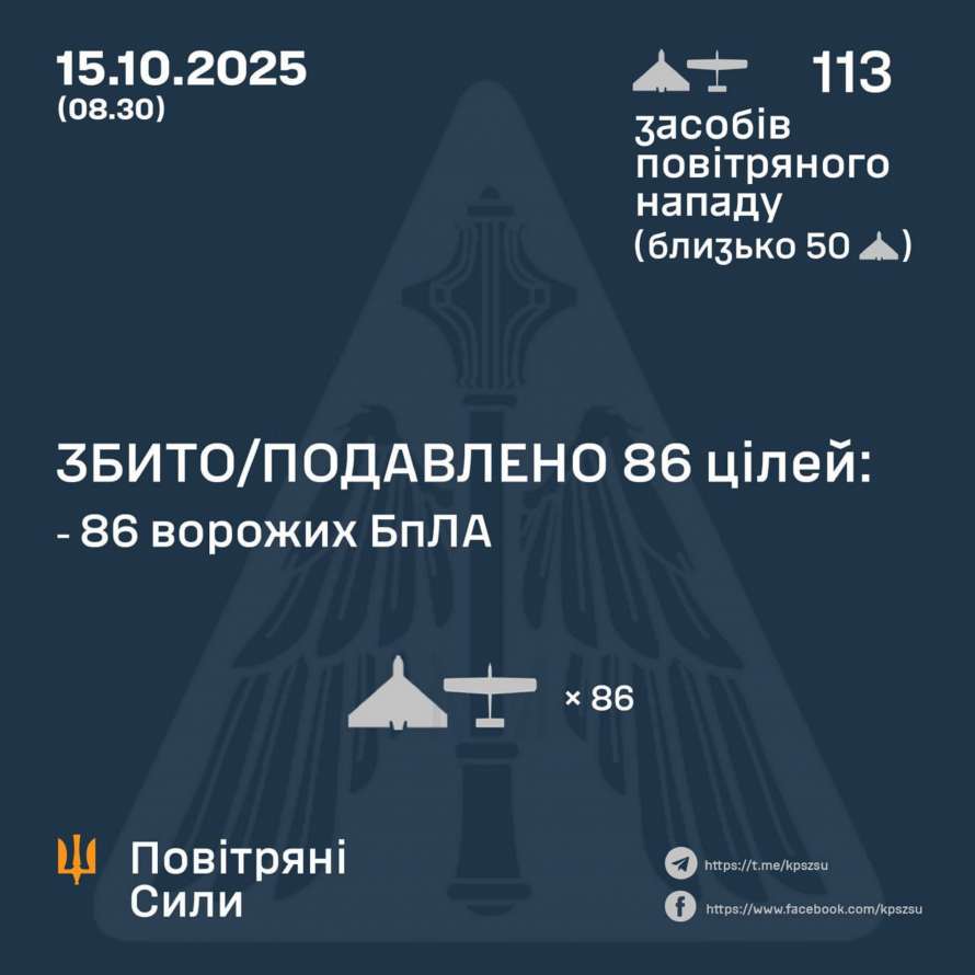 В ночь на 15 октября (с 22:50 14 октября) противник атаковал 113 ударными БПЛА типа Shahed, Гербера и беспилотниками других типов с направлений: Миллерово, Брянск, Курск, Приморско-Ахтарск – РФ, около 50 из них – «шахеды».