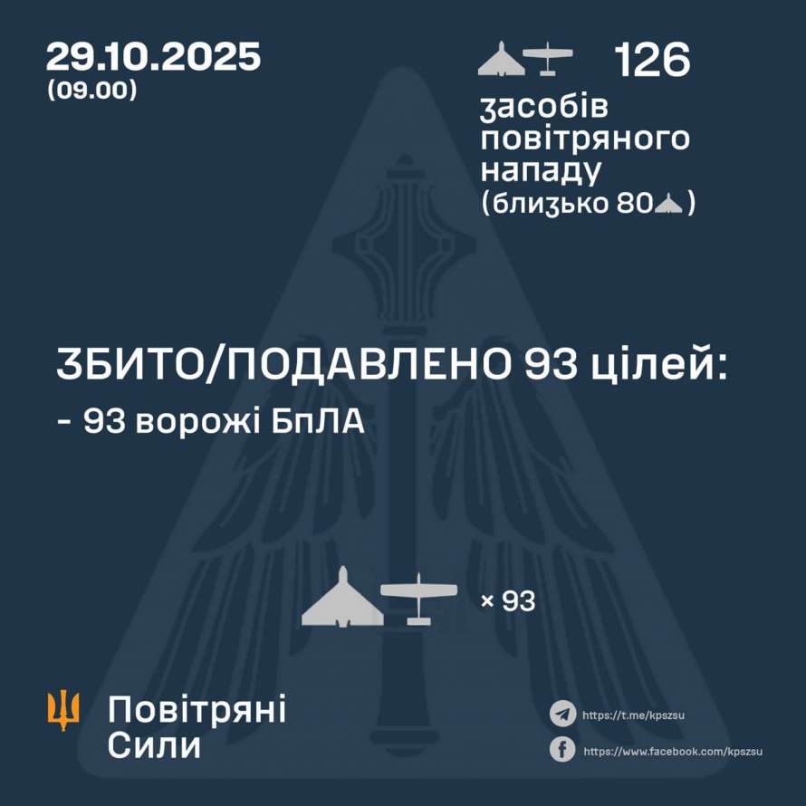 В ночь на 29 октября (с 19:00 28 октября) противник атаковал 126 ударными БПЛА типа Shahed, Гербера и беспилотниками других типов с направлений: Курск, Приморско-Ахтарск – РФ, Донецк, Чауда, Гвардейское – ТОТ Украины, около 80 из них – «шахеды».