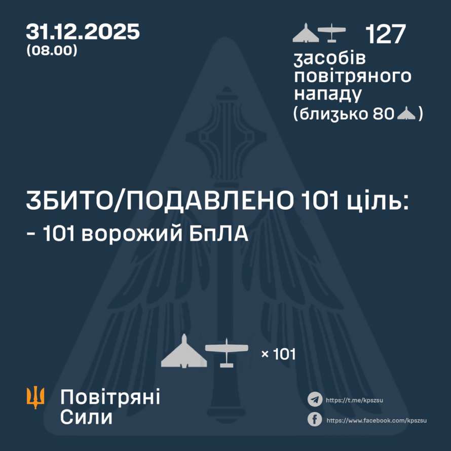 В ночь на 31 декабря (с 18:00 30 декабря) противник атаковал 127 ударными БПЛА типа Shahed, Гербера и беспилотниками других типов с направлений: Курск, Орел, Брянск, Миллерово, Приморско-Ахтарск – РФ, Чауда – ТОТ АР Крым, около 80 из них – «шахеды».