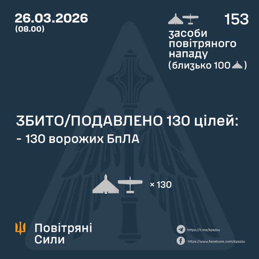 В ночь на 26 марта (с 18:00 25 марта) противник нанес удар 153 ударными БПЛА типов Shahed, Гербер, Италмас и беспилотниками других типов со следующих направлений: Брянск, Курск, Орел, Миллерово, Приморско-Ахтарск — РФ, Гвардейское, Чауда – ТОТ АР Крым, около 100 из них – «шахеды».