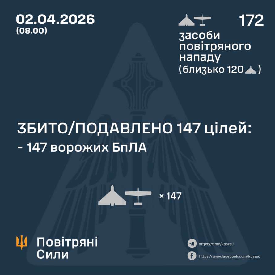 По предварительным данным, по состоянию на 08:00 противовоздушной обороной сбито/подавлено 147 враждебных БпЛА типа Shahed, Гербера, Италмас и дронов других типов на севере, юге и востоке страны.