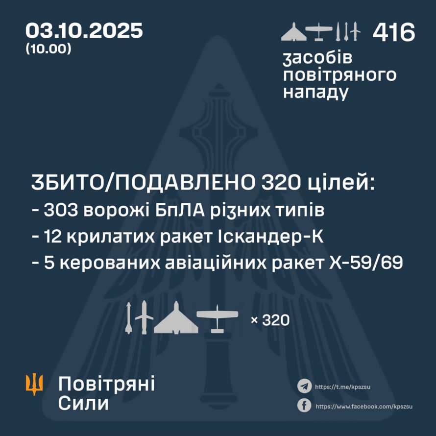 В ночь на 3 октября (с 20.00 02 октября) противник нанес комбинированный удар по территории Украины с применением ударных БпЛА, ракет воздушного и наземного базирования, всего – 416 средств воздушного нападения: