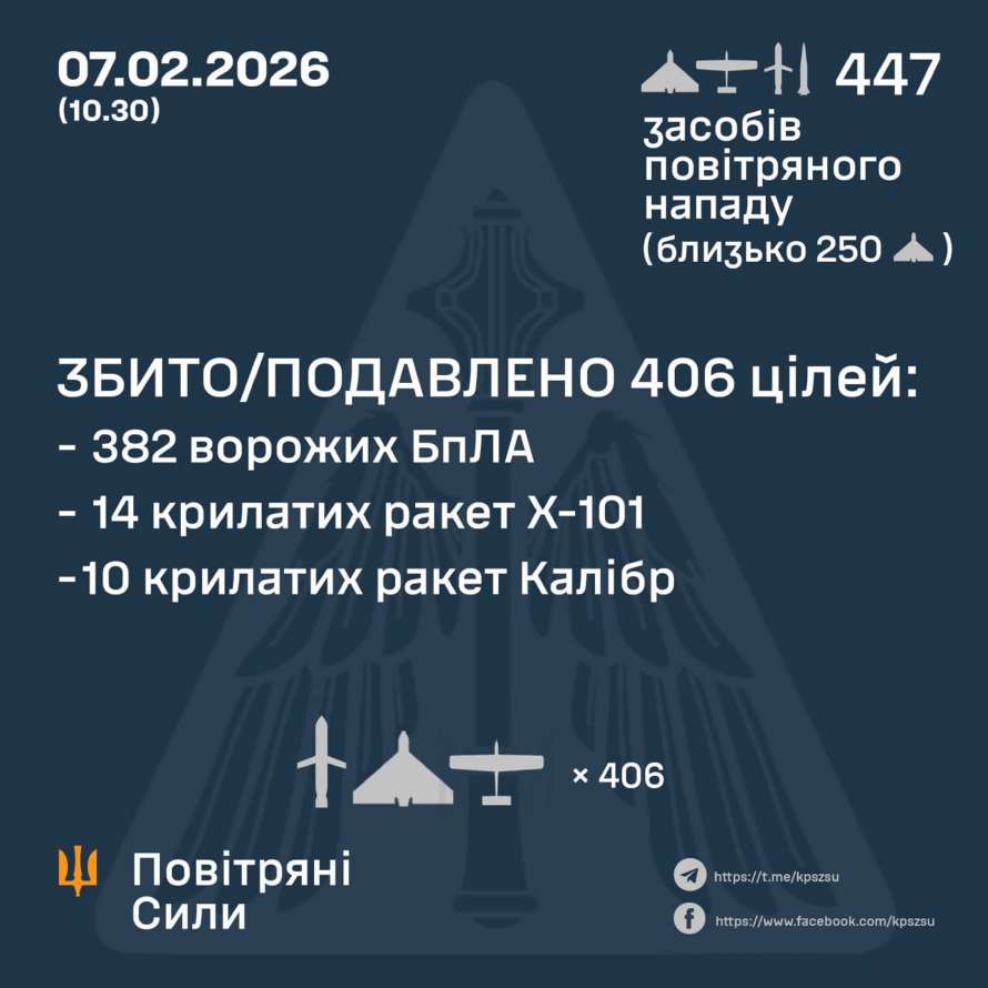 В ночь на 7 февраля (с 19:00 6 февраля) противник нанес комбинированный удар по объектам критической инфраструктуры Украины с применением ударных БПЛА, ракет воздушного, наземного и морского базирования.