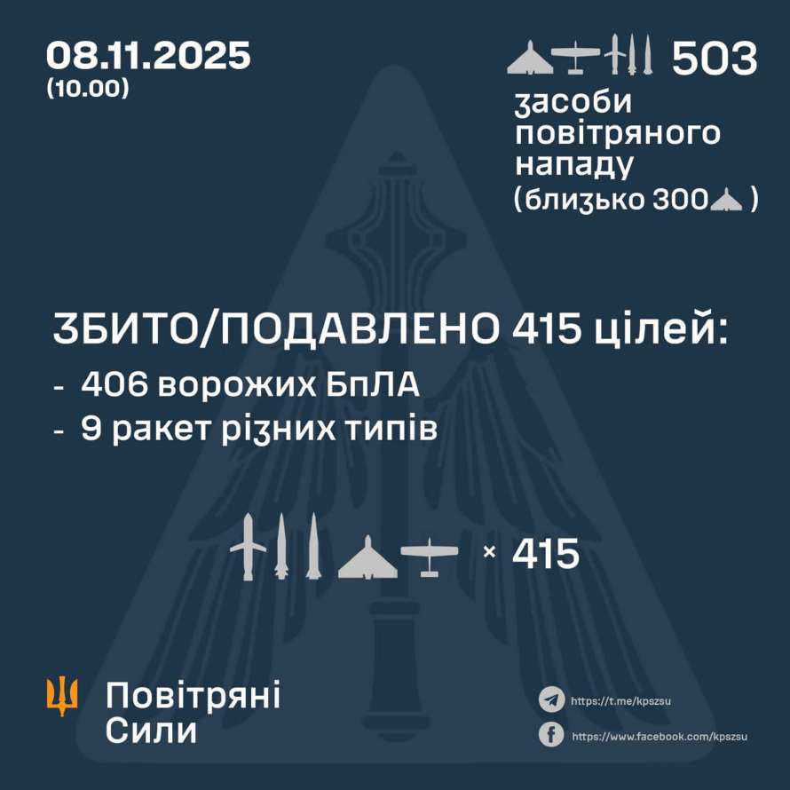 По предварительным данным, по состоянию на 10.00, противовоздушной обороной сбито/подавлено 415 воздушных целей: