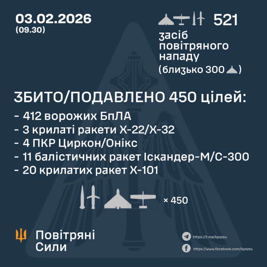 По предварительным данным, по состоянию на 09:30, противовоздушной обороной сбито/подавлено 450 целей – 38 ракет и 412 беспилотников различных типов:
