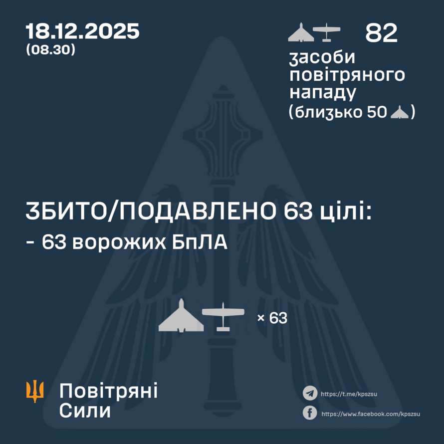 В ночь на 18 декабря (с 18:00 17 декабря) противник атаковал 82 ударными БПЛА типа Shahed, Гербера и беспилотниками других типов с направлений: Миллерово, Курск, Орел, Приморско-Ахтарск – РФ, около 50 из них – «шахеды».