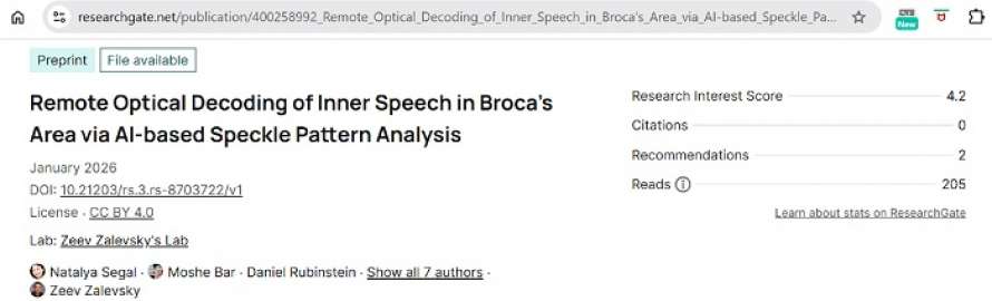 A research team from Bar-Ilan University is exploring a question that once belonged purely to science fiction: can inner speech — the silent “yes” or “no” we say to ourselves — be decoded without touching the head, without electrodes, and without surgery? Using laser-based optical sensing combined with artificial intelligence, the researchers achieved an accuracy of 95.7% in distinguishing silent “yes” versus “no” responses from the Broca language area of the brain (where speech is created), requiring only about one minute of subject-specific calibration per class.