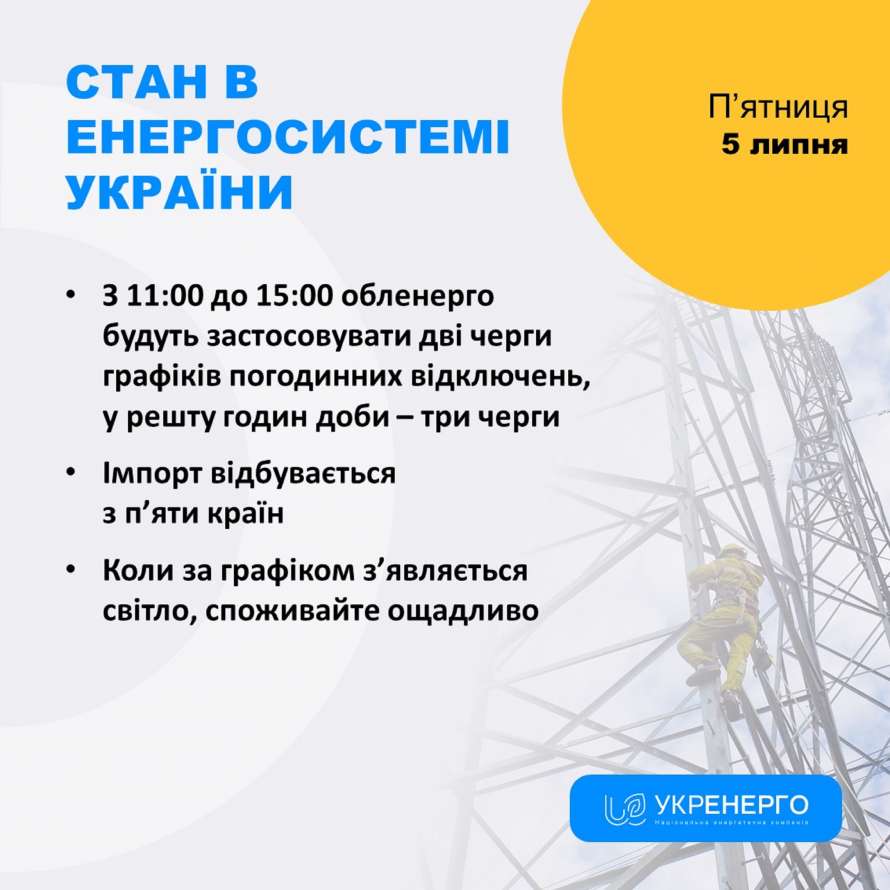 Графики отключения электроэнергии в Украине будут действовать весь день 5 июля.