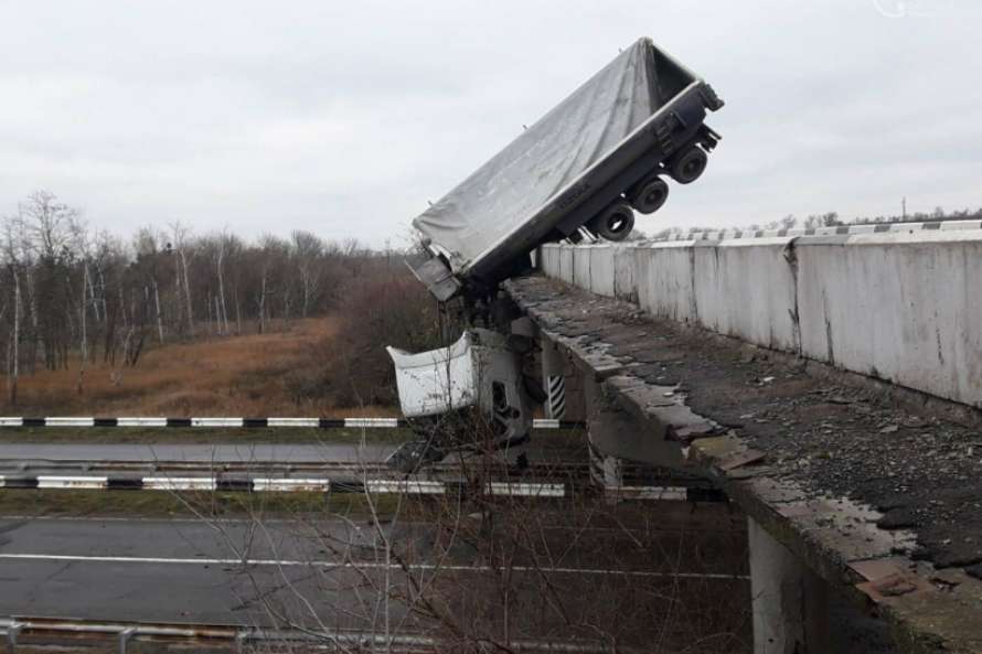 26 ноября в Донецкой области на трассе Мариуполь – Волноваха фура слетела с моста и повисла над проезжей частью. Водитель не справился с управлением. Об этом сообщает сайт города Мариуполя