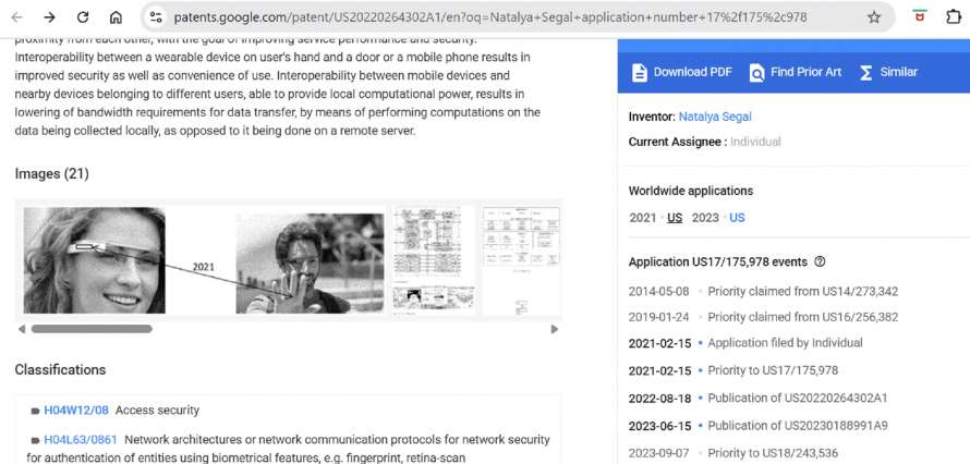 Image 2: Screenshot is taken from the “cited by” section of the following patent: https://patents.google.com/patent/US20220264302A1/en?oq=Natalya+Segal+application+number+17%2f175%2c978