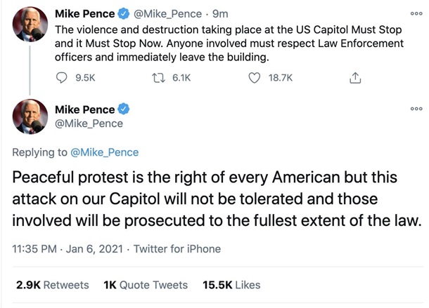 Вице-президент США Майк Пенс требует остановить насилие и покинуть здание Конгресса. По его словам, все виновные в силовом захвате здания понесут наказание.