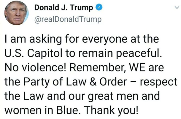 Трамп в Twitter продолжает призывать к порядку.
