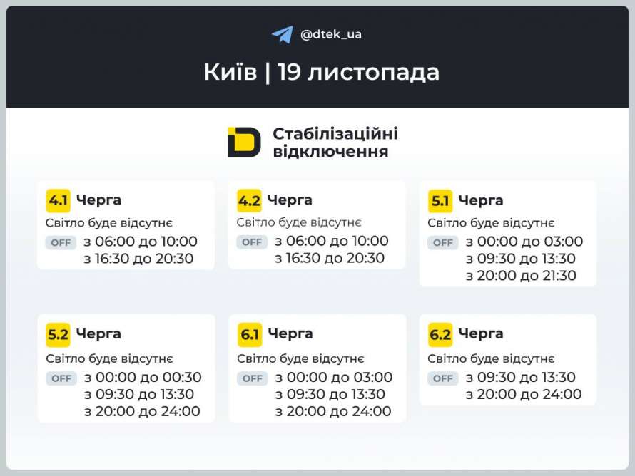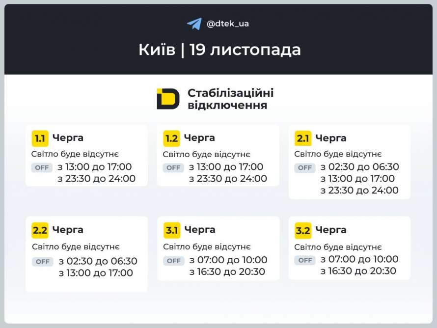 ДТЭК обнародовал в Telegram графики отключений света в Киеве завтра, 19 ноября.