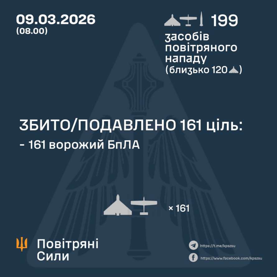 По предварительным данным, по состоянию на 08:00, противовоздушной обороной сбито/подавлено 161 вражеский БПЛА типа Shahed, Гербера, Италмас и дроны других типов на севере, юге и востоке страны.