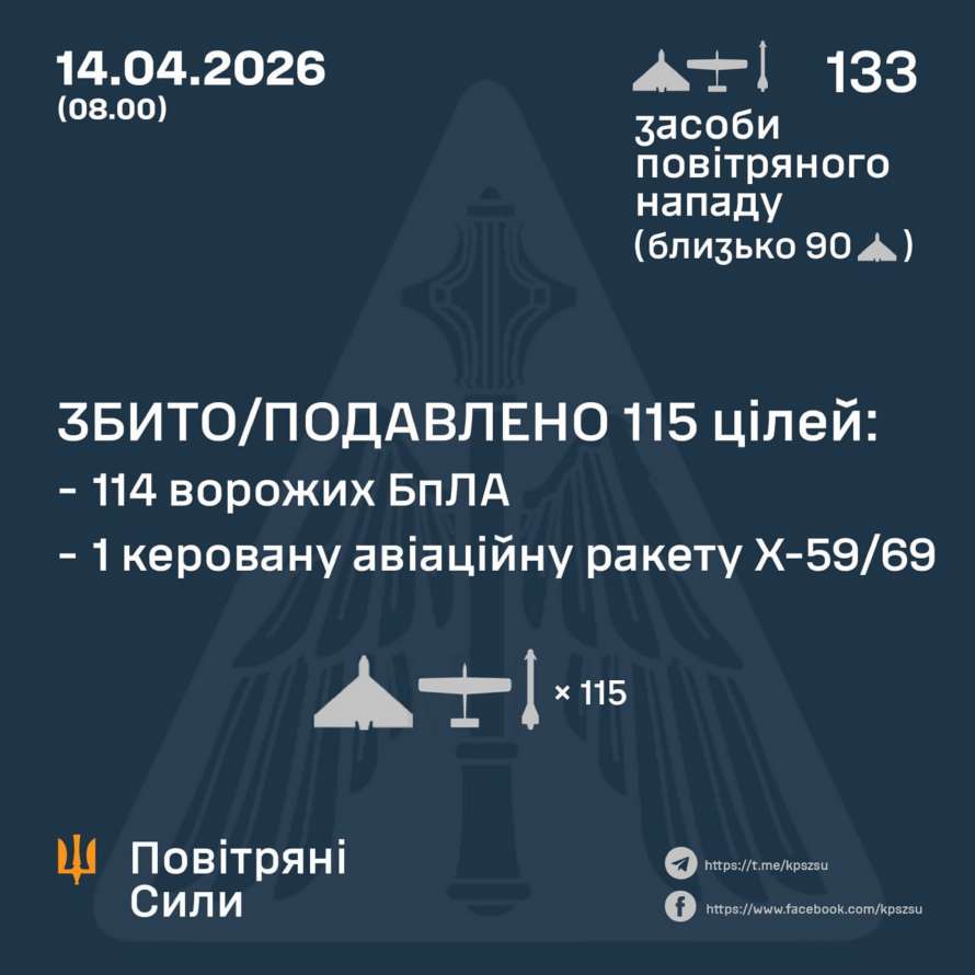 В ночь на 14 апреля (с 18:00 13 апреля) противник нанес удар четырьмя управляемыми авиационными ракетами Х-59/69 из ТВТ Донецкой области, а также 129 ударными БПЛА типов Shahed, Гербер, Италмас и беспилотниками других типов со следующих направлений: Курск, Орел, Брянск, Приморско-Ахтарск – РФ, ТОТ Донецк, Чауда – ТОТ АР Крым, около 90 из них – «шахеды».
