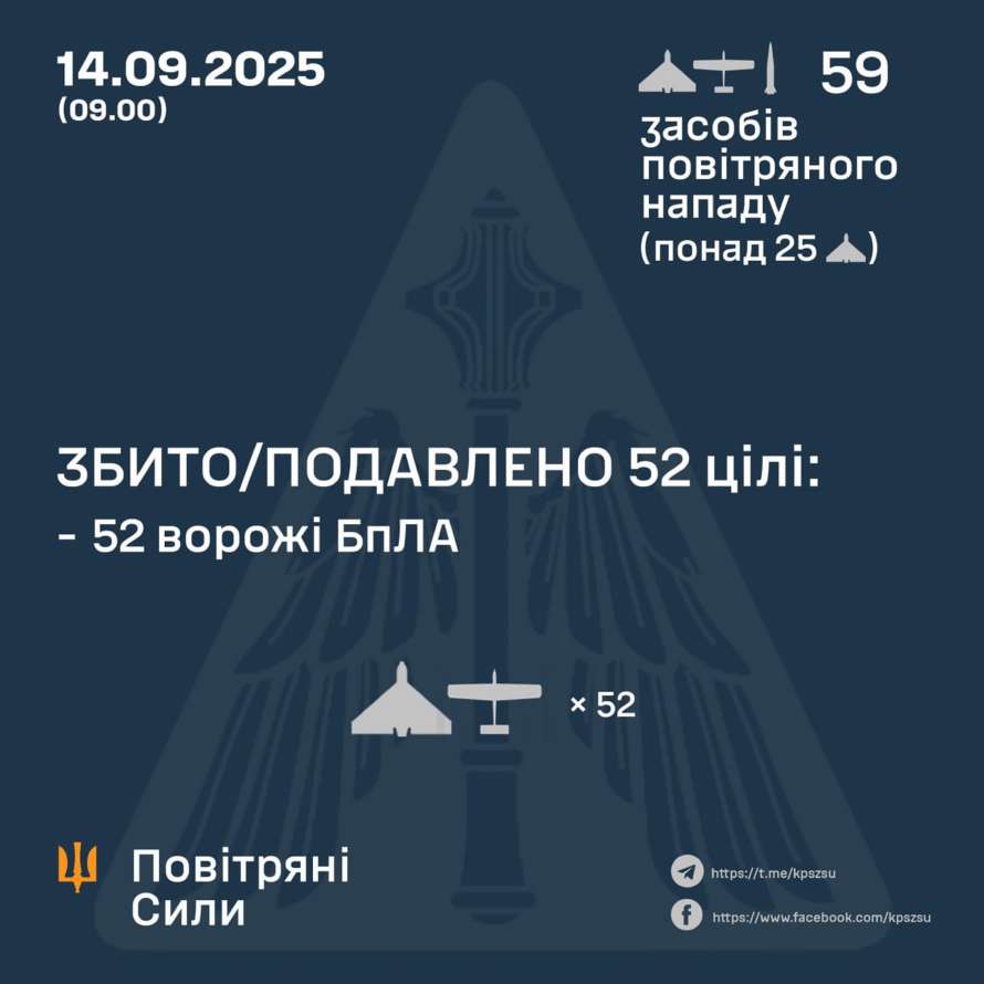 По предварительным данным, по состоянию на 09.00, противовоздушной обороной сбито/подавлено 52 вражеских БПЛА типа Shahed, Гербера и дронов других типов на севере, юге, востоке и в центре страны.