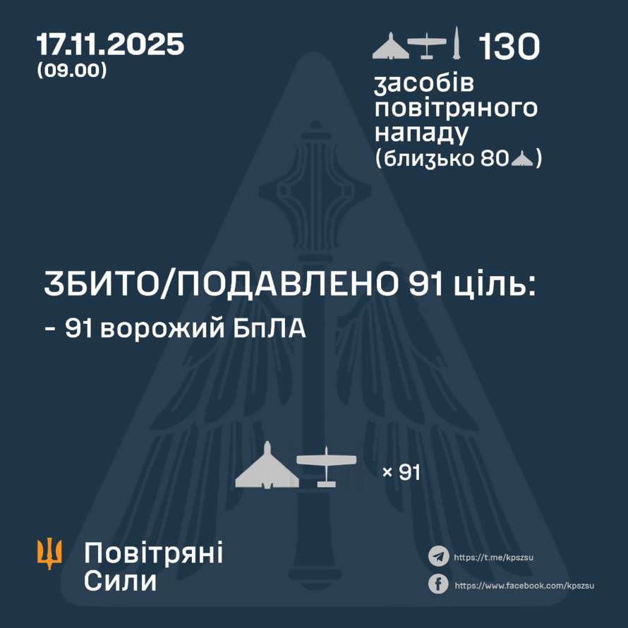 По предварительным данным, по состоянию на 09:00, противовоздушной обороной сбито/подавлено 91 вражеский БПЛА типа Shahed, Гербера и дронов других типов на севере, юге и востоке страны.