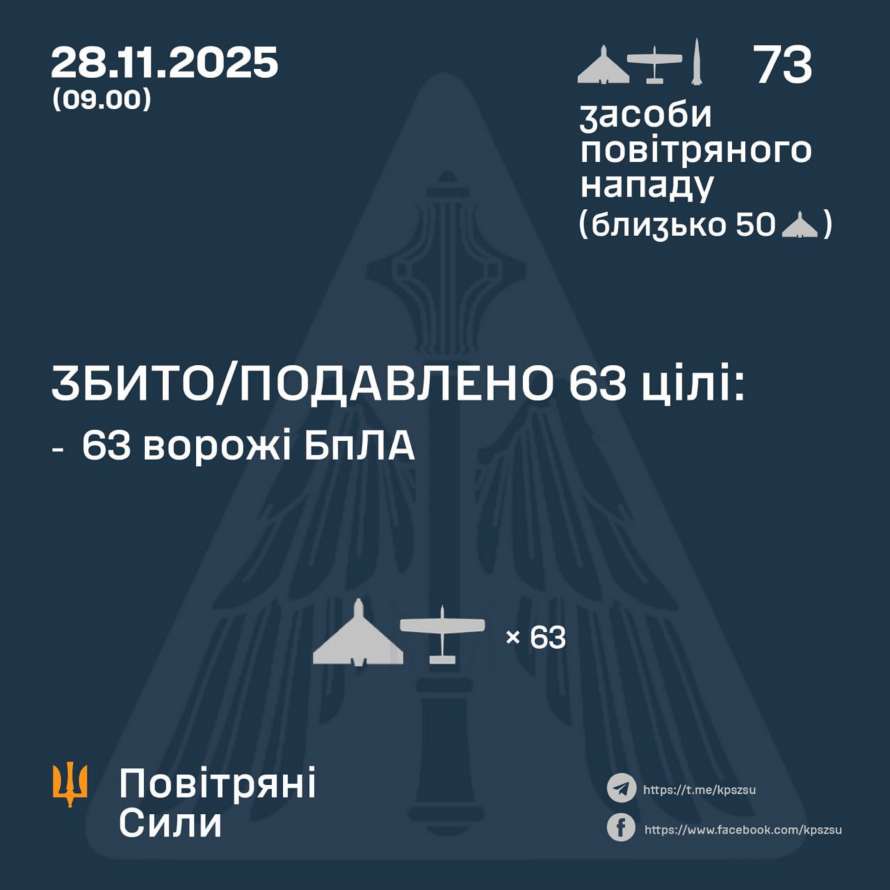 В ночь на 28 ноября (с 18:00 27 ноября) противник атаковал одной баллистической ракетой Искандер-М из ТОТ АР Крым и 72 ударными БПЛА типа Shahed, Гербера и беспилотниками других типов из направлений: Орел, Брянск, Миллерово – РФ, около 50 из них – «шахеды».
