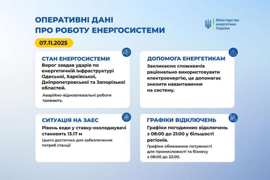 7 ноября, графики почасовых отключений применяются с 08:00 до 21:00 в большинстве регионов Украины.
