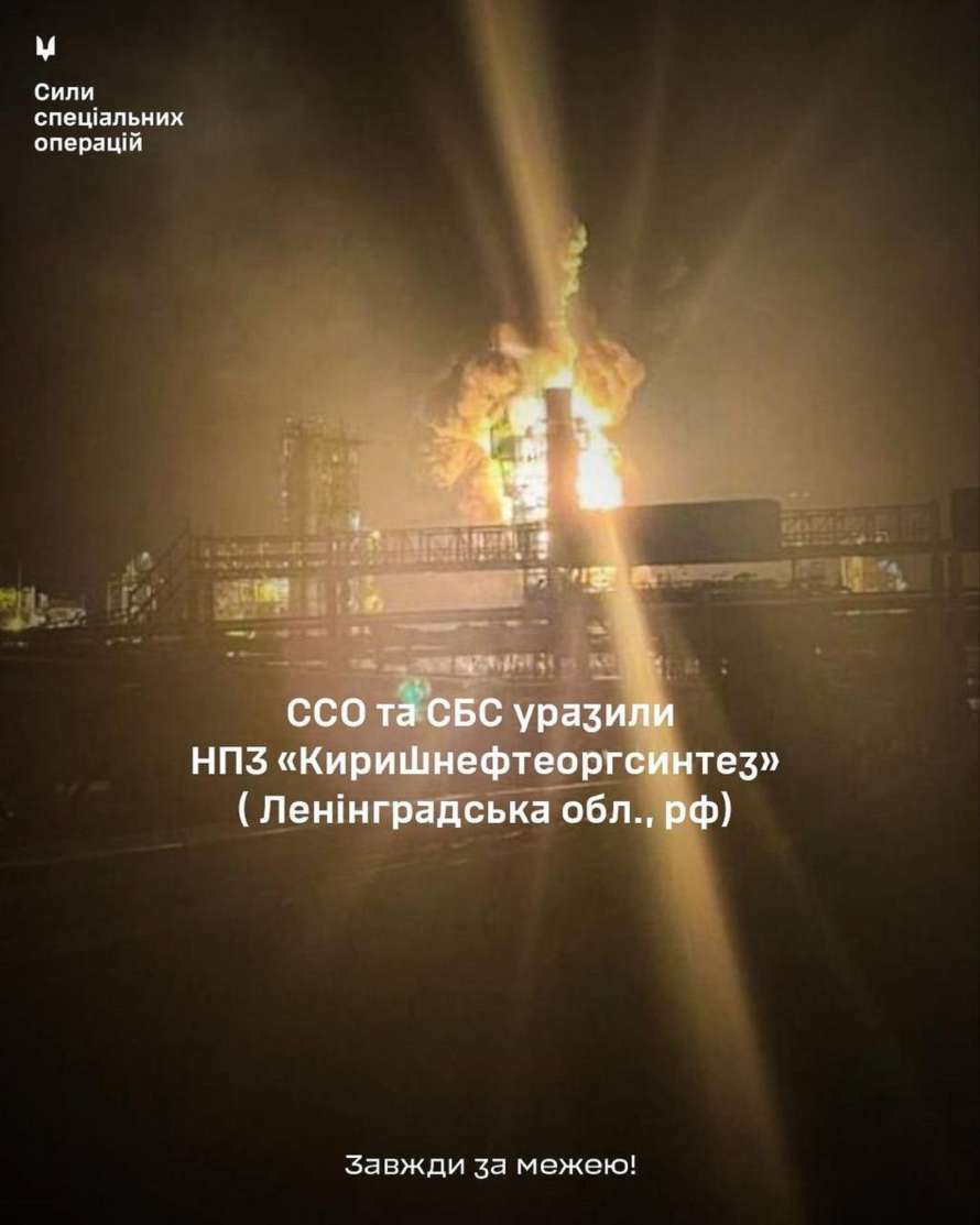 "Совместные действия провели Силы специальных операций вместе с Силами беспилотных систем. Этот нефтеперерабатывающий завод является одним из лидеров в РФ по объемам переработки нефти, которая составляет около 20 млн. тонн в год", - сообщают ССО.