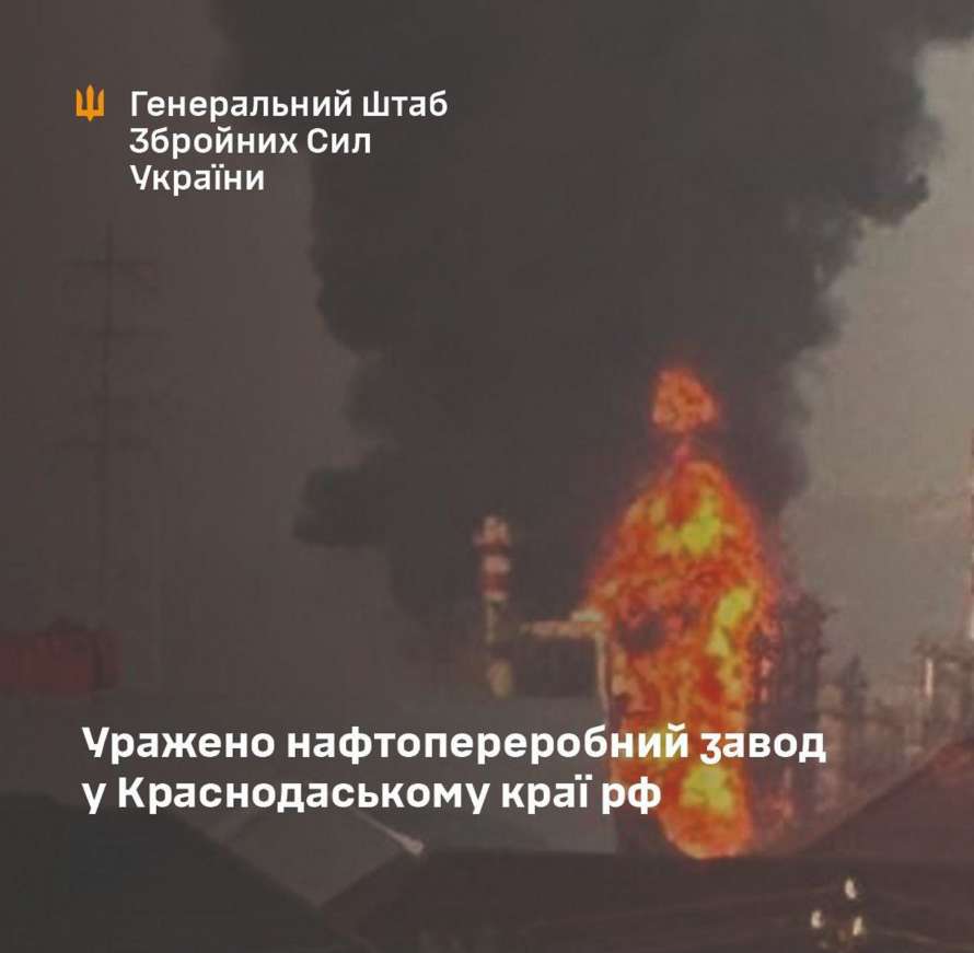 "Подтверждено поражение Афипского нефтеперерабатывающего завода в Краснодарском крае. Годовой объем его переработки составляет 6,25 млн тонн в год, а это 2,1% от общего объема нефтепереработки РФ", - сообщает Генштаб ВСУ.