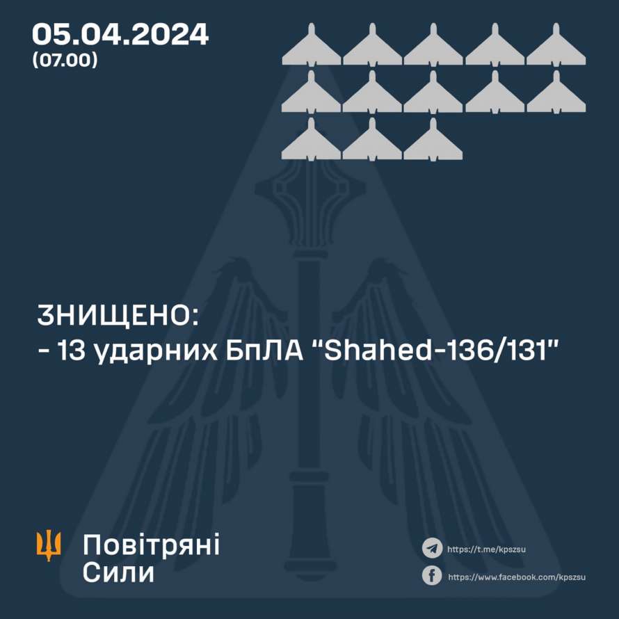 "Ночью 5 апреля противник атаковал двумя зенитными управляемыми ракетами С-300/С-400 и тремя баллистическими ракетами "Искандер-М" (районы пусков Белгородская область РФ), а также 13 ударными БпЛА типа Shahed-131/ 136 из района мыса Чауда (Крым)", - говорится в сообщении Воздушных сил ВСУ.