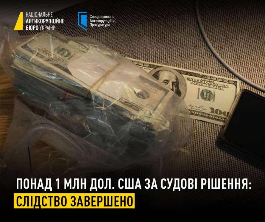 "Прокурор САП принял решение о завершении досудебного расследования по делу в отношении бывших председателей хозяйственного суда одной из областей, а также бывшего председателя и судьи апелляционного хозяйственного суда, подозреваемых в вымогательстве и получении средств от представителя частной компании за принятие судебных решений, а также влияние на судей, которые рассматривали соответствующие судебные дела", - сообщает НАБУ.