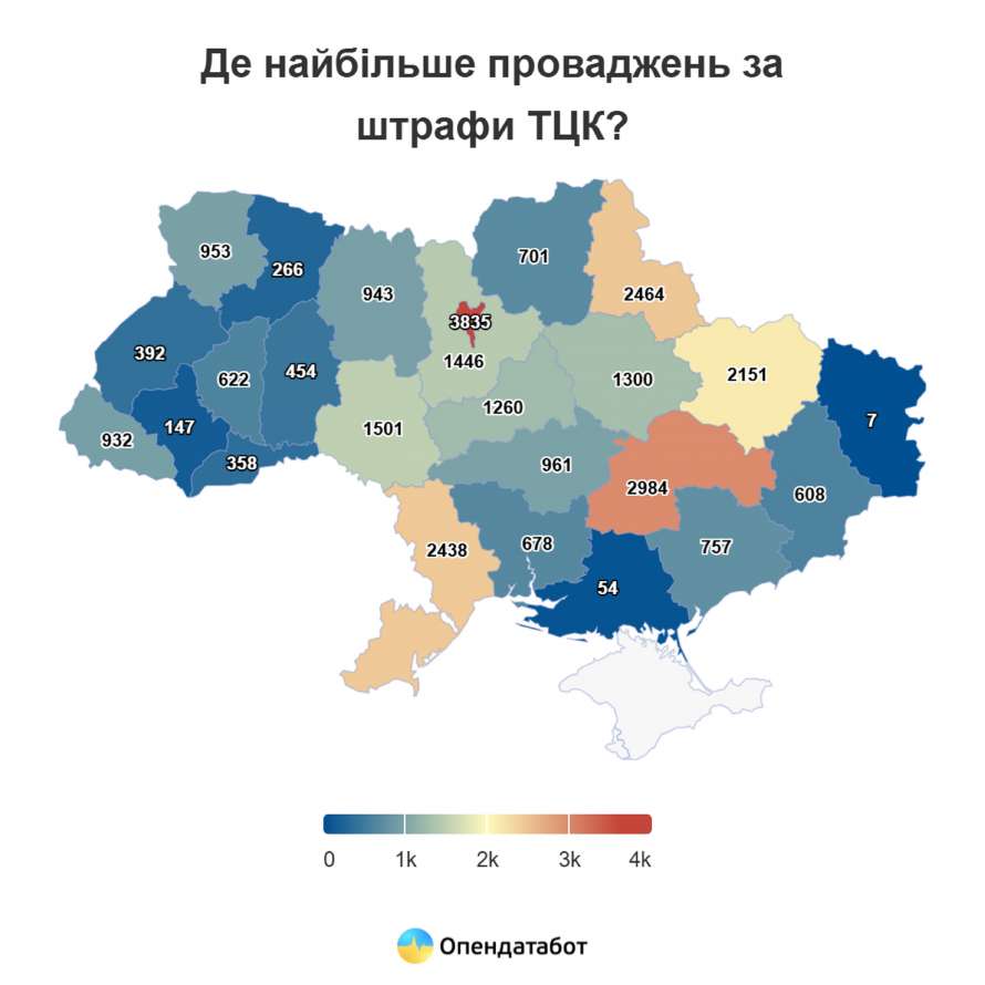 Лидером по количеству штрафов от ТЦК является Киев - 3 835 производств с начала года. Следуют Днепропетровская (2 984), Сумская (2 464), Одесская (2 438) и Харьковская (2 151) области.