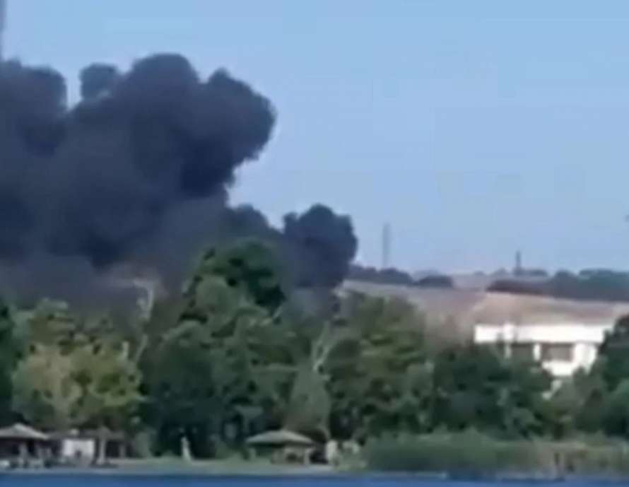 Над складом поднимается столб черного дыма. Происходит детонация боеприпасов.